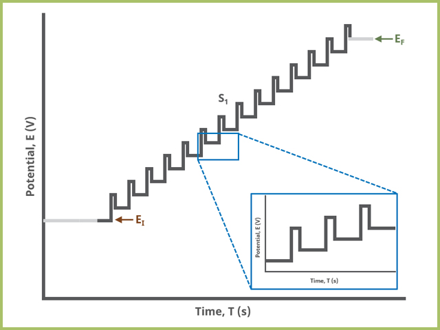 最も単純なケースでは、セグメント(SN)= 1(図1を参照)の場合、電位パルスは線形ベースラインに沿って初期電位から最終電位までステップし、指定された間隔で電流をサンプリングします(図2を参照)。