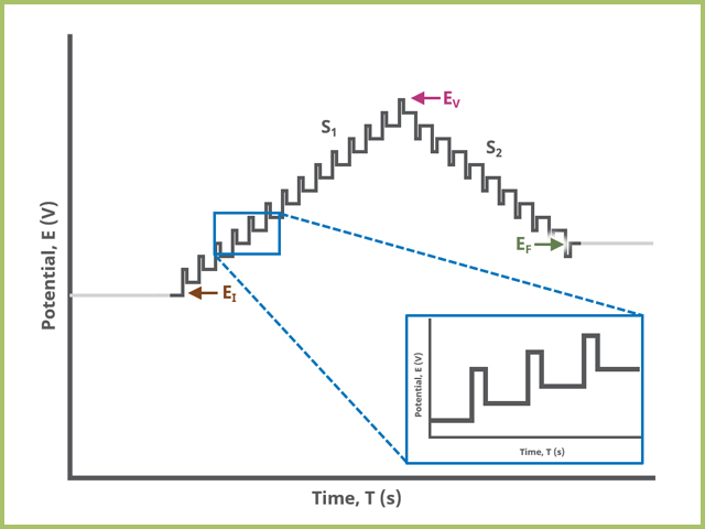 微分パルスボルタンメトリー(DPV)は、波形が線形ベースラインに沿って増加する一連のパルスであるという点で、サイクリックボルタンメトリー(CV)などの一般的な手法にいくつかの利点を提供する定電位法です。 各パルスで電流を測定する方法は、バックグラウンド(充電)電流の測定を最小限に抑えるのに役立ちます。 関連するパルスタイプの方法には、通常パルスボルタンメトリー(NPV)および方形波ボルタンメトリー(SWV)が含まれます。